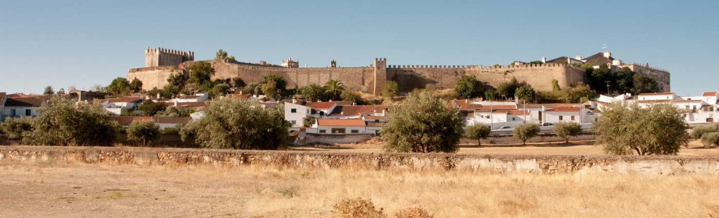La muralla está reforzada por cubos y otres de planta cuadrangular y semicircular, rematada por merlones prismáticos. Tenía 5 puertas, de las que restan la de Beja y la de Morua, ambas flaqueadas por dos torreones cilíndricos chafados