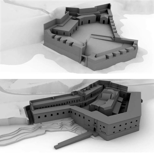 – Frente de Tierra: formado por dos baluartes en los extremos y una cortina entre ambos con una planta en ángulo.