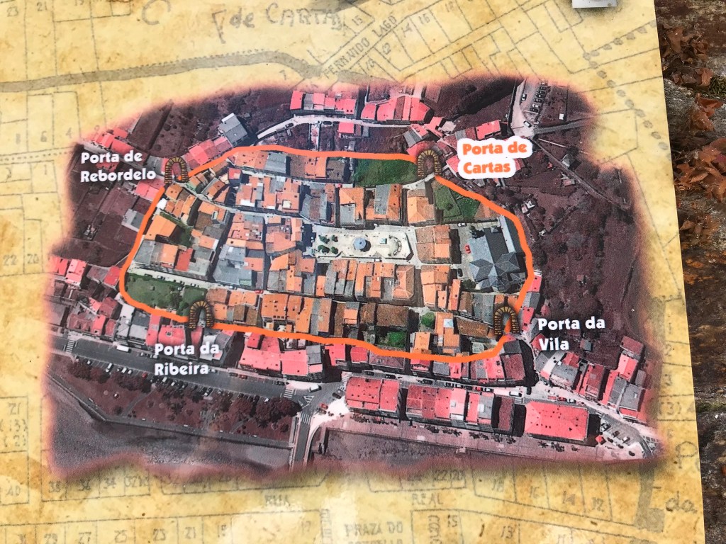 Poco se conoce de la muralla, si bien el entramado urbano permite adivinar su trazado. Los Chavales de CEIP Nicolás del Río hicieron un excelente trabajo de investigación, y divulgación señalizando las diferentes puertas. Fueron cuatro puertas las que daban acceso al recinto: la de la Vila, la de Cartas, la Rebordelo y la de la Ribeira