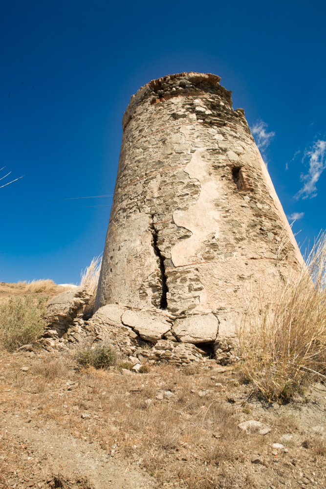 Tiene forma troco-cónica y planta circular, dispone de un diámetro de 8,35 metros y una altura de 10,50 metros. El hueco de acceso al interior de la habitación superior se sitúa al norte. Tiene dos plantas. La planta alta tiene 3.50 metros de diámetro. La baja tiene una altura de 2.50 metros y un diámetro de 3.35 metros, disponiendo de las cuatro troneras habituales de este tipo de torres. Tiene intacta la garita de salida a la terraza y parte del peto de la misma.