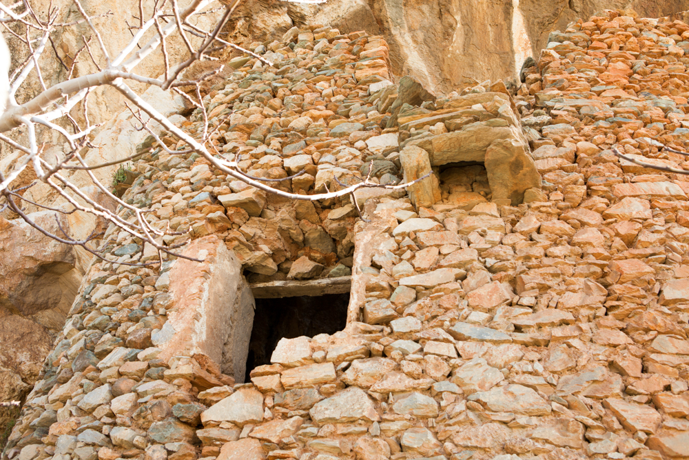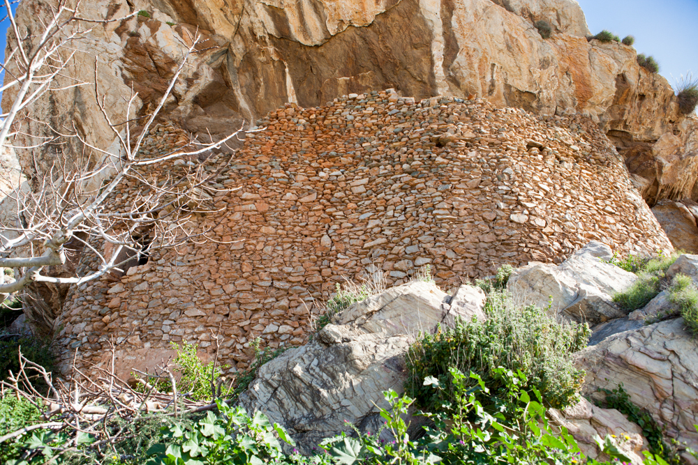 Dicho muro de fachada, con una altura total aproximada de unos 9 metros, encaja en sus extremos este y oeste en las paredes de la roca que lo cobija. Por la parte superior, el muro llega también hasta la roca, cubriéndose la planta de terraza de forma natural, evitando así que pueda ser atacado por esta parte, si bien aquí el muro no es continuo en toda su longitud ya que deja espacios para la defensa, a modo de troneras o almenas.
