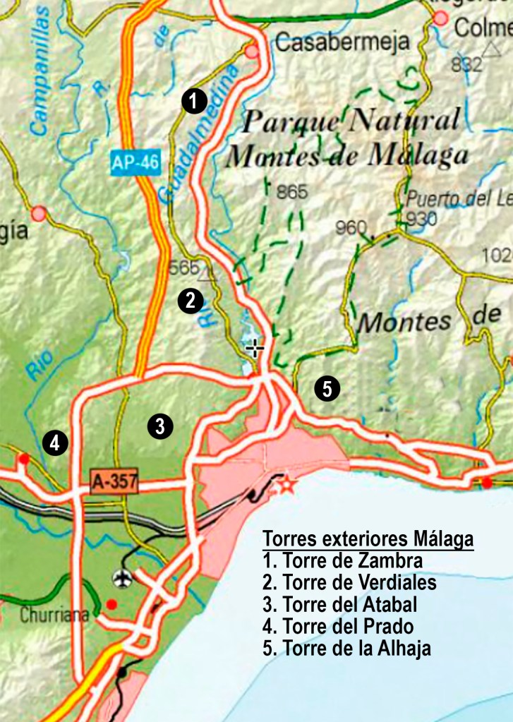 Como se ve en el plano que aporto, se han encontrado un total de cinco torres en el entorno de la capital. De norte a sur, la de Zambra (que se encuentra en terrenos de Casabermeja), la de la Reina o Verdiales, la de Atabal, la del Prado y finalmente la de la Alhaja, un poco distinta de las anteriores. La de Zambra y la del Atabal han sido completamente restauradas.
