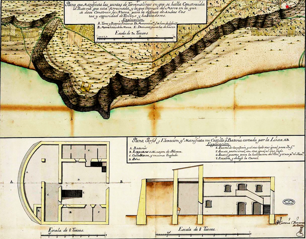 En Torremolinos existieron dos baterías costeras en el siglo XVIII. La primera de ellas ya estaba edificada en 1739 junto a la Torre de Pimentel. Pero parece ser que la ubicación de esta batería de cañones resultó totalmente ineficaz para la defensa de la costa. Así al menos lo argumentó Antonio Jiménez Mesa, Ingeniero Extraordinario de los Reales Ejércitos, que planteó en 1762 a Carlos III construir a su costa un fuerte o castillo en la punta de Torremolinos [actual Santa Clara], con 6 cañones y las oficinas, cuarteles y almacenes correspondientes, que sirviese de cobijo a embarcaciones frente al acoso de las naves corsarias.