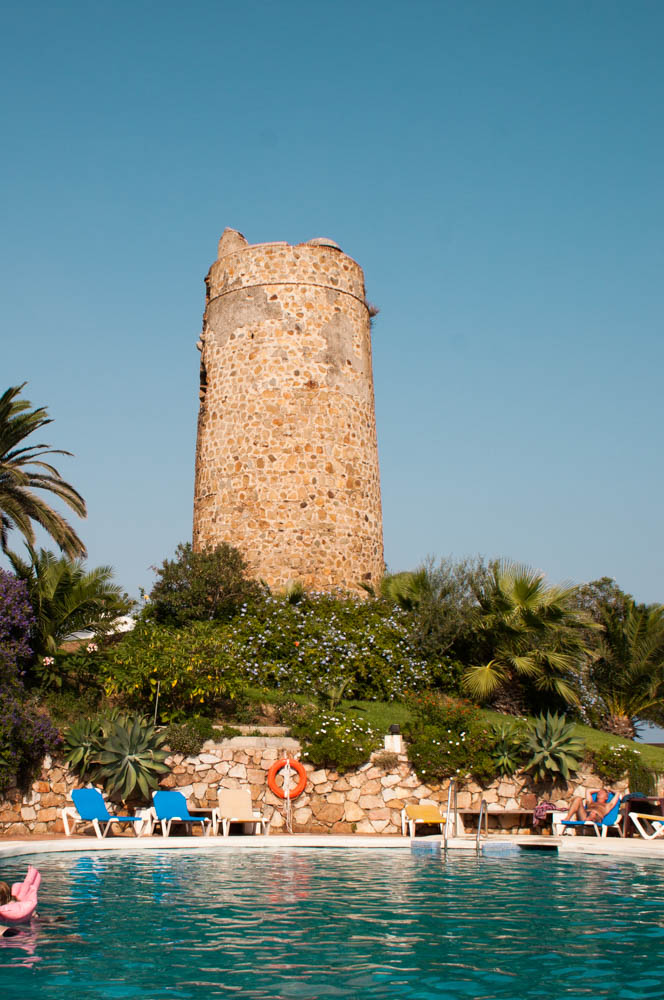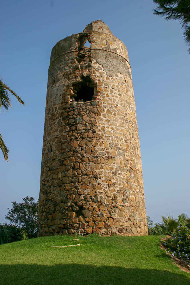 La Torre que nos ocupa está integrada en la zona verde de un conjunto residencial en la costa de Mijas. Es de forma troncocónica, con una imposta de ladrillo a la altura del pretil; tiene garita y una ventana cuadrada pequeña frente al mar; el ingreso está en el lado opuesto, a 6,60 metros de altura. Su altura es de 10, 65 metros y la base tiene un diámetro de 5,65 metros. Es prácticamente cilíndrica.