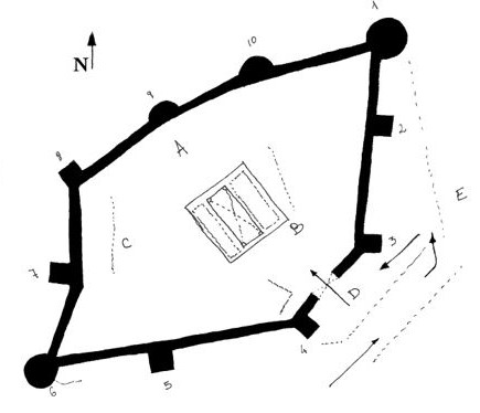 La planta es de unos 1.200 m2. Se observan torres en los lados este, norte y sur y algunas zonas con estructura muraria