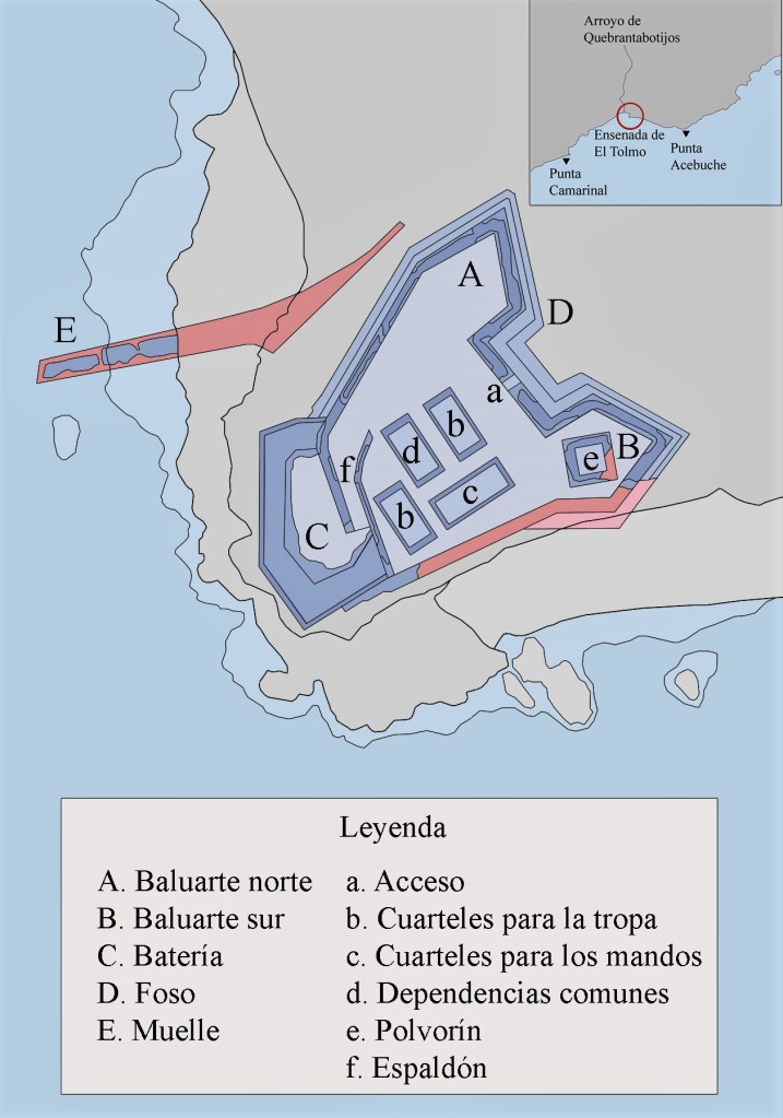 La ensenada de El Tolmo está situada en la costa del estrecho de Gibraltar, entre Algeciras y Tarifa, es un buen punto de fondeo y a su vez una zona fácil de defender desde tierra. Parece ser que aquí hubo una almenara y primer fuerte destruido por los ingleses en 1739.