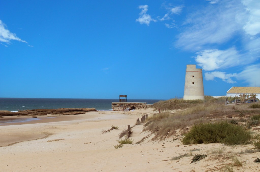 Vejer tiene sólo ocho km. de costa, pero ocupada en buena parte por la extraordinaria playa de El Palmar. Allí precisamente se sitúa la Torre Nueva o de El Palmar.