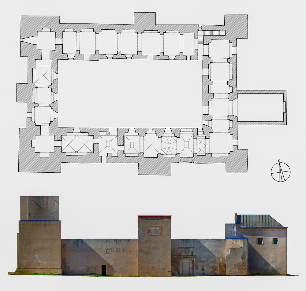 Tiene un patio de armas central, rectangular, con unas medidas aproximadas de 33×15 m. Está delimitado por cuatro naves, entre ellas la más alta es la occidental. Cada una de las naves está formada por una serie de habitaciones abovedadas, en la planta baja existen veintiséis.