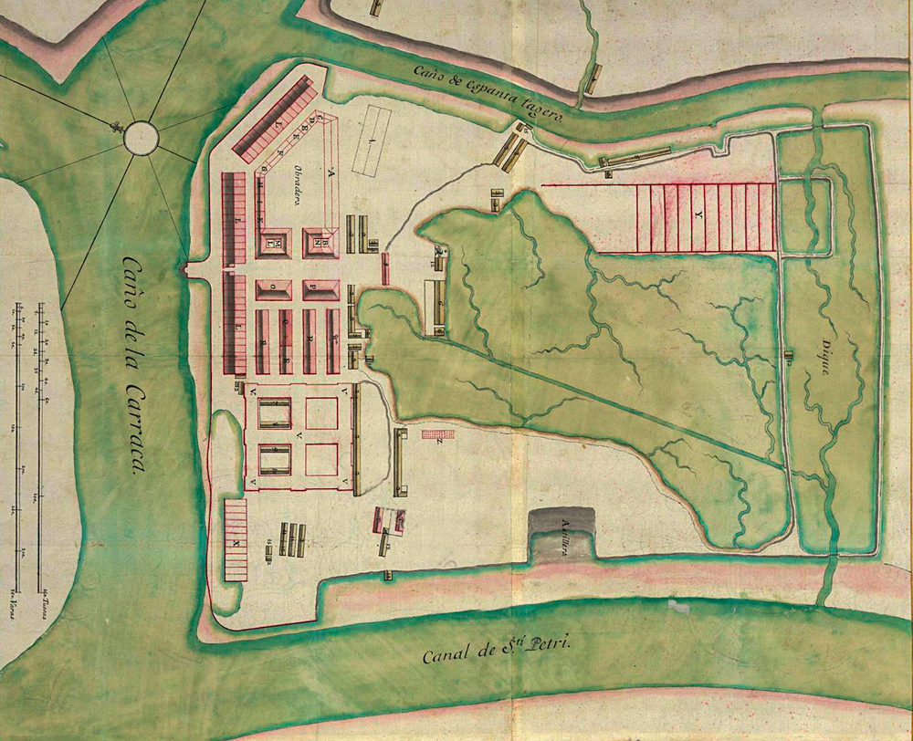 Puede decirse que la construcción del Arsenal de la Carraca se desarrolló durante todo el siglo XVIII. En la primera mitad del siglo XVIII se levanta la cabecera del Arsenal (almacenes, teneduría, obradores, residencias y parte de los muelles). Hacia 1733 se construye la portada principal del Muelle de San Fernando.