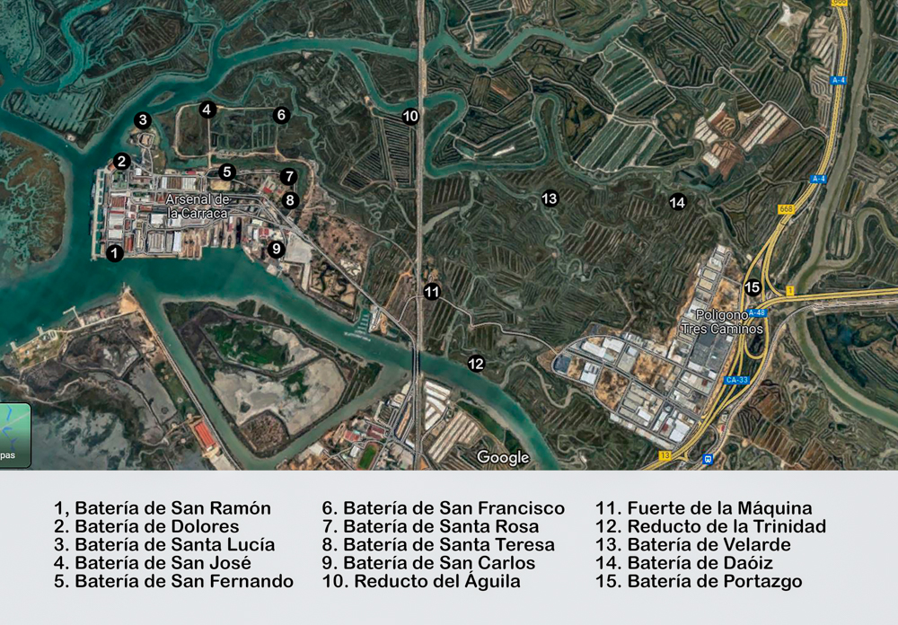 En los alrededores de la Carraca se levantaron las baterías de San Francisco, de San José, el Águila y el imponente Fuerte de la Máquina. Y más en primera línea las baterías de Velarde y Daóiz