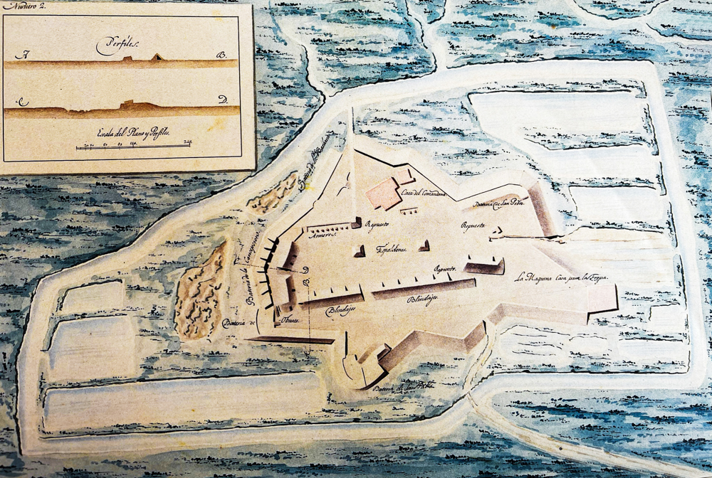 Se levantó sobre un lecho de fango lo que dificultó enormemente su construcción. Debe su nombre a que, según se cuenta, la isla pantanosa sobre la que se asienta comenzó a formarse por los sedimentos acumulados alrededor de una carraca encallada. En los trabajos se utilizó a un colectivo de marginados como esclavos moros y turcos, desterrados y vagabundos, que eran la mano de obra gratuita o muy barata para realizar las tareas más duras.