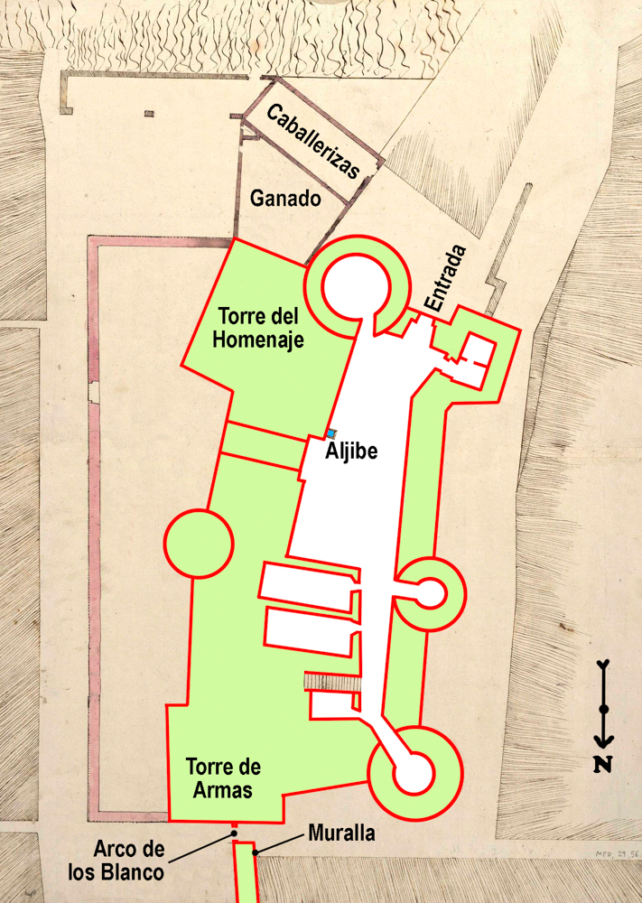 La planta del castillo era prácticamente cuadrangular de unos 43×25 metros. La fachada oriental asomaba por la calle de San Juan de Dios ensamblándose aquí con la muralla medieval con el aún existente Arco de los Blanco