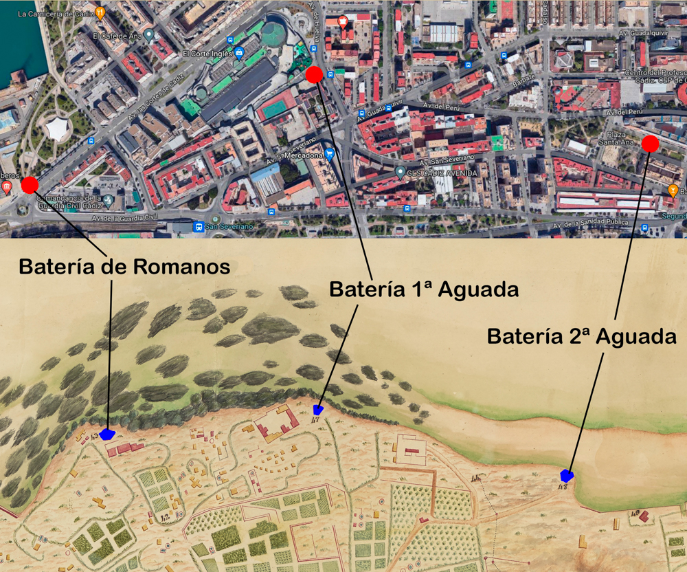 Como se dijo en otra entrada, las fortificaciones que defendían Cádiz se fueron construyendo a lo largo de los siglos XVI a XIX. En la parte de Extramuros, Puerta de Tierra para la gente de Cádiz, encontramos el Real Fuerte de la Cortadura de San Fernando, levantado en los primeros años del siglo XIX; el Fuerte de San Lorenzo del Puntal, que se erigió en el siglo XVI, pero que luego fue reconstruido en varias ocasiones; una serie de reductos en la zona de cortadura construidos expresamente durante el asedio francés, que han desaparecido; y tres baterías en el siglo XVIII, que miraban hacia la Bahía, la de Romano y las de Primera y Segunda Aguada.