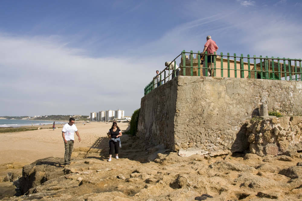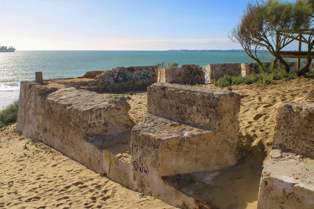 Recorriendo la costa partiendo de la desembocadura del Guadalete, la primera que encontramos en el Fortín de La Laja o Castillo de la Pólvora. Situado sobre un promontorio saliente a la izquierda de la desembocadura del Guadalete, tenía forma trapezoidal con la artillería dispuestas con dos lados en ángulo dirigidos hacia la boca del río. Contaba con varias estancias cubiertas, entre ellas un polvorín.