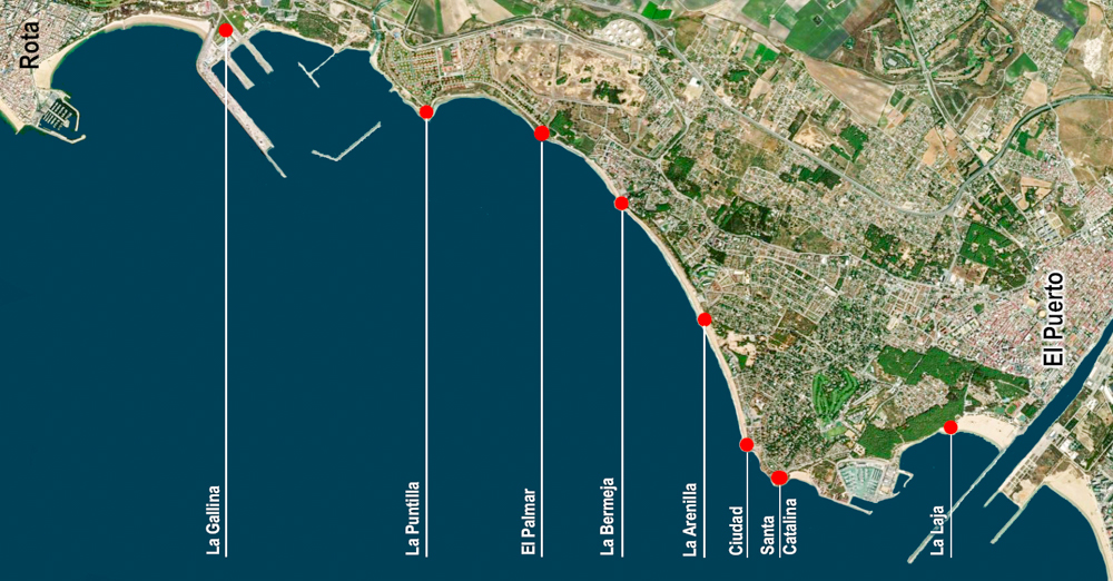 Estas baterías fueron La Laja (Castillito de La Pólvora); La Ciudad (Fuerte Ciudad); La Arenilla (Pinar de Mochicle); La Bermeja (entre Las Redes y El Manantial); El Palmar (Playa de Los Curas); La Puntilla y La Gallina (ya en el actual término municipal de Rota).