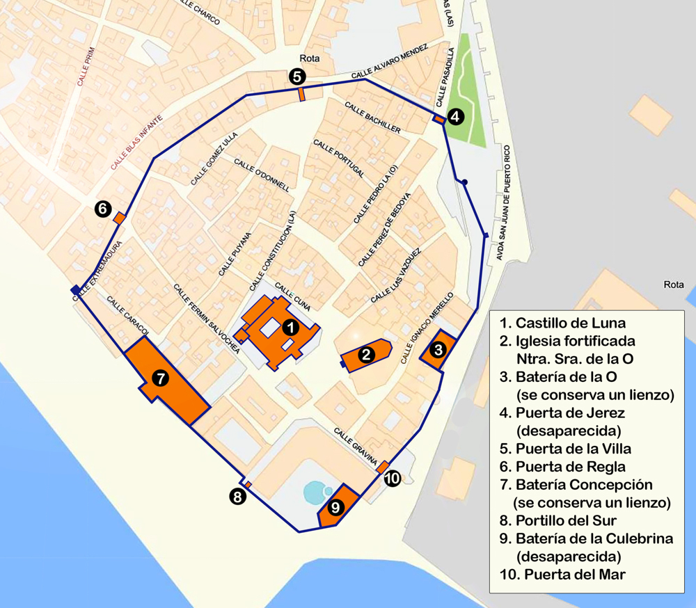 Se tienen constancia de ataques turcos y berberiscos a Rota en el siglo XVI. Uno en 1559, cuando se destruyó la galera del capitán general que pasaba el invierno en Rota. Otro en 1562, y otro más en 1572. Por ello, a partir de la segunda mitad del siglo XVI se planteó adaptar la muralla para el uso artillero, construyendo baterías y baluartes con su merlatura y pabellones.