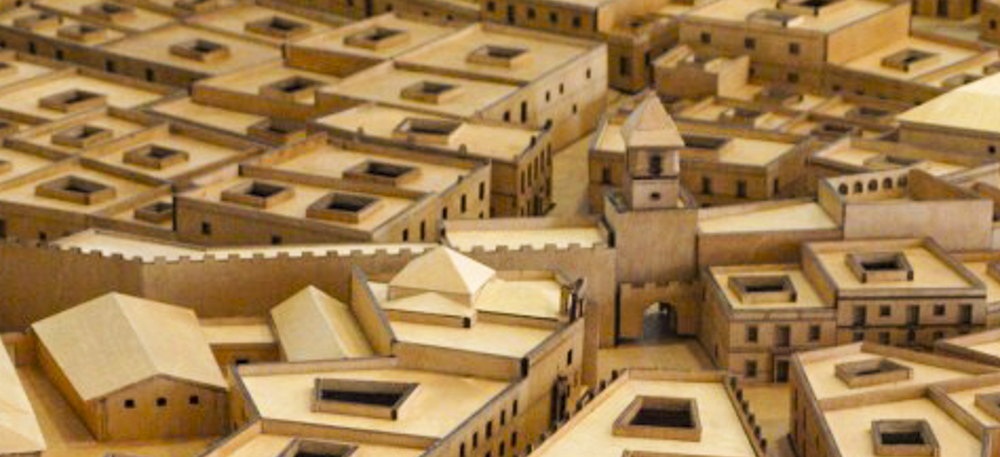 Arriba Puerta de la Villa en el siglo XVIII, según la maqueta de Rota[i]