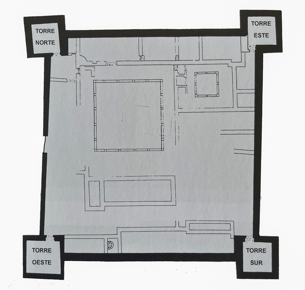 Se trata, ya lo dije más arriba, de un castillo pequeño, de planta casi cuadrada —entre 44 y 45 metros cada uno de sus lados— y del que nos han llegado pocos elementos, pero fácilmente interpretables: las cuatro torres, si bien incompletas, de sus esquinas y los lienzos de muralla que las unían. En total ocupa una superficie de algo más de 2.200 metros cuadrados.
