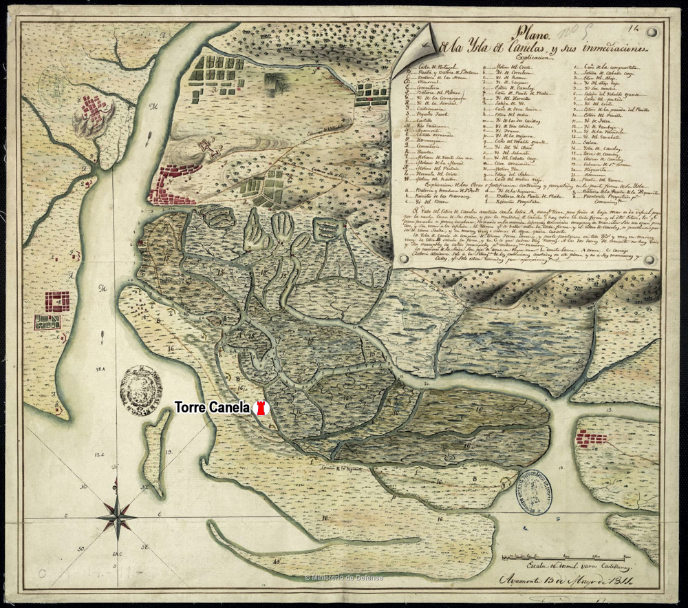 La torre se encuentra en la Isla Canela, ubicada junto a la carretera que une el casco urbano de Ayamonte con la barriada Punta del Moral. Hoy está situada a unos dos km. de la línea de la costa y a 3 km. de Portugal, como consecuencia de las transformaciones que se producen en este litoral. Debido a ese desplazamiento de la línea de la costa, para 1756 dejó de estar artillada, si bien continuó teniendo un gran valor estratégico por dominar tanto la costa como la entrada del río y aunque no disponía de capacidad de defensa por su gran distancia al cauce y a la orilla del mar, si tenía gran valor de vigilancia y de aviso a los castillos y baluartes de la zona.